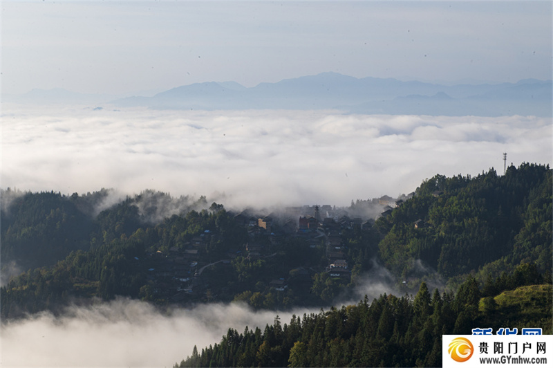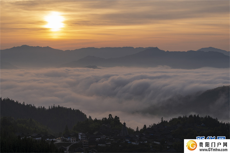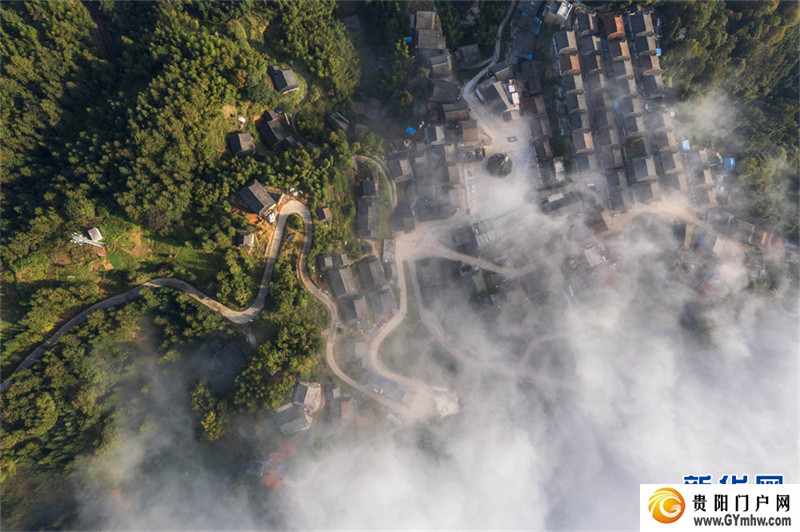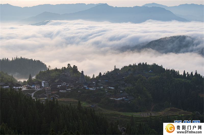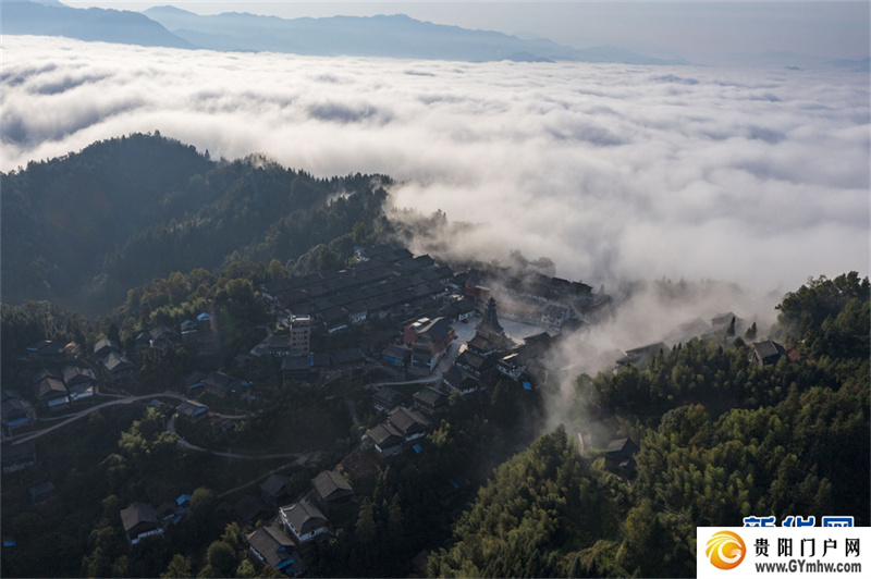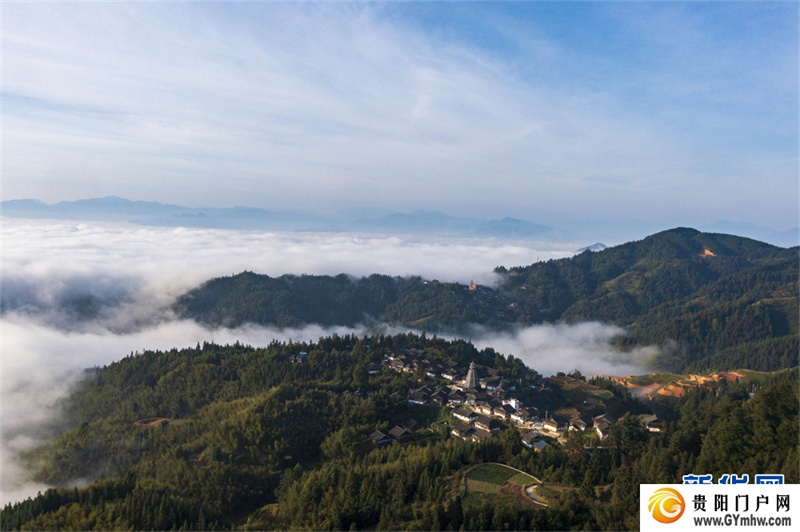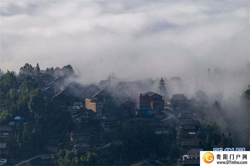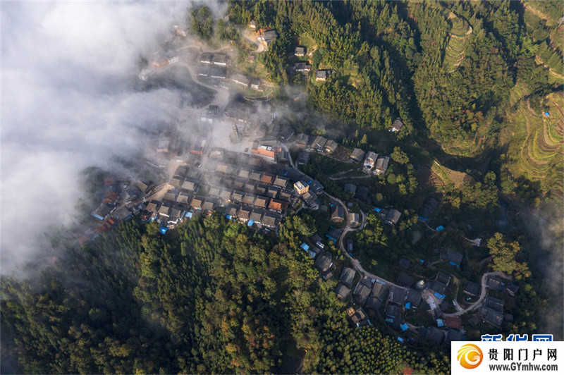 深秋时节,位于贵州省黔东南苗族侗族自治州从江县高增乡天鹅山的新生村云雾缭绕,侗家吊脚楼、鼓楼掩映其间,美如画卷。